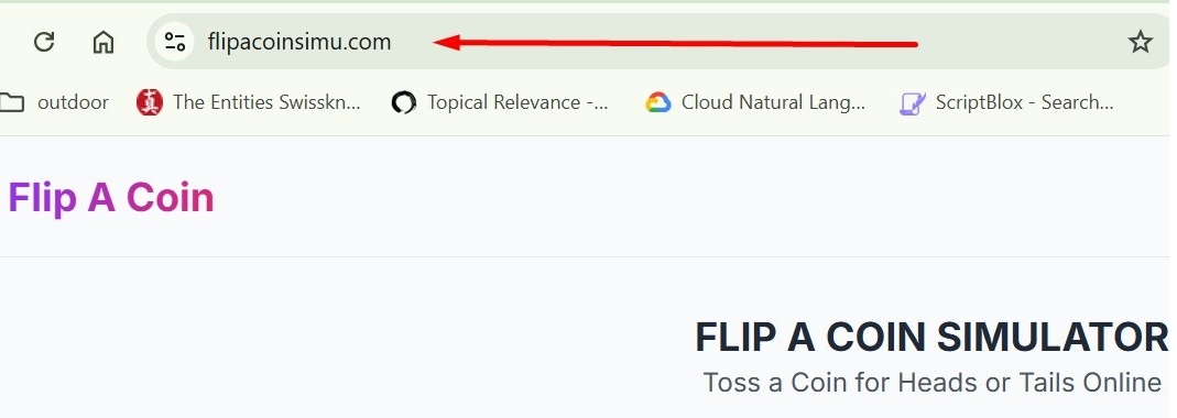 You will see the main interface with the title "FLIP A COIN SIMULATOR" and the option to "Toss a Coin for Heads or Tails Online."