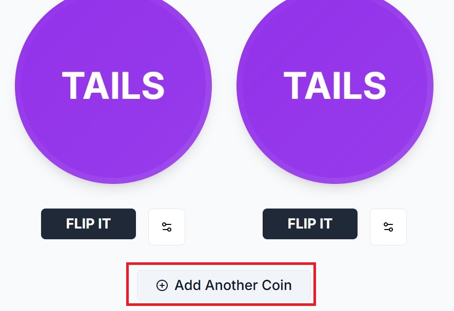 Click "Add Another Coin" to flip multiple coins simultaneously. Press the Space Bar to flip all at once.